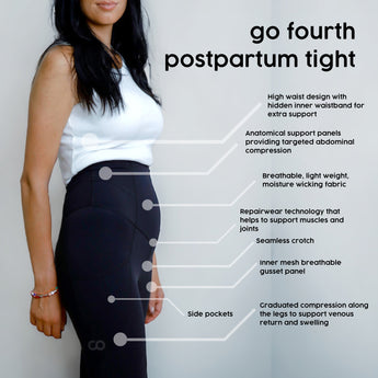 Please note - Our postpartum tights feature targeted core compression designed specifically to aid muscle recovery after birth, making them unsuitable for wear during pregnancy. For support during pregnancy, check out our Go Fourth pregnancy tights.